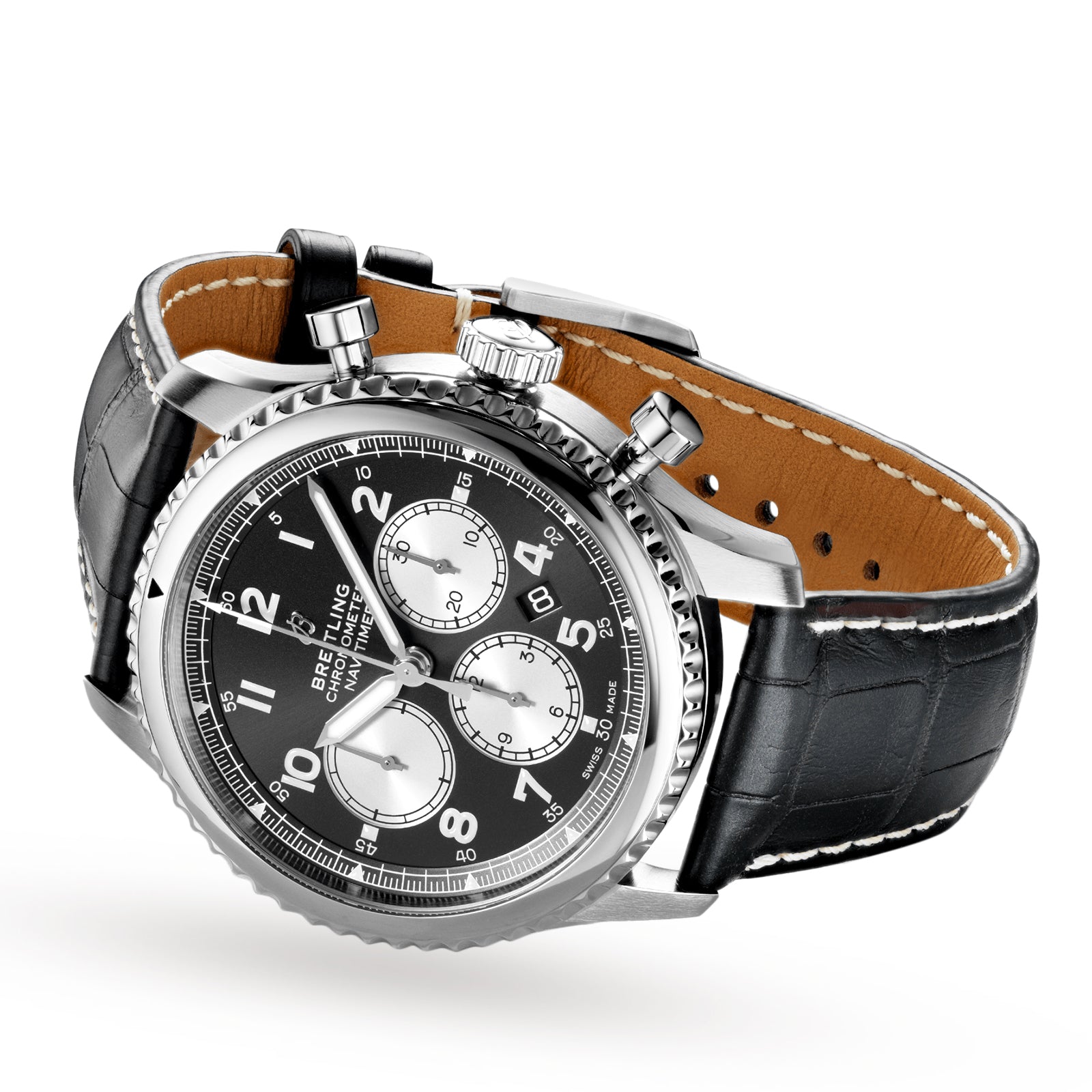 A timepiece favoured by professionals and collectors alike. Featuring 43mm stainless steel case, a date and chronograph complication, and a power reserve of 70 hours. Powered by an automatic movement tested to the highest standard. Water-resistant to 100 metres. Presented on a black leather strap and secured with a pin buckle clasp.