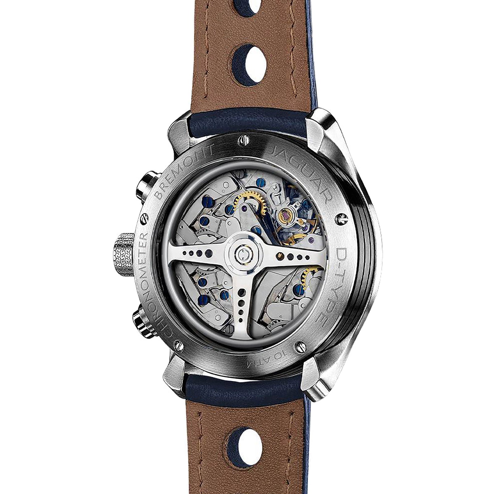 Inspired by the iconic Jaguar D-Type this new addition to the range is limited to only 300 pieces. The blue dialled bi-compax chronograph has brushed nickel sub-dials and a Tachymeter dial ring with its chronometer rated movement housed in a 43mm satin finished three-piece Trip-Tick® case. The large exhibition sapphire case back shows the beautifully finished mechanical BE-50AE movement and the very intricate Jaguar steering wheel inspired rotor. The watch crown has the original Dunlop tyre tread etched into it and the heritage Jaguar logo finished beautifully in enamel on its end. Ian Callum, Jaguar's Director of Design has signed each leather wallet packaging for this exclusive model.