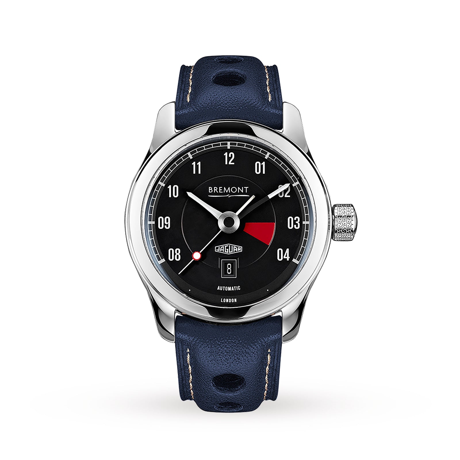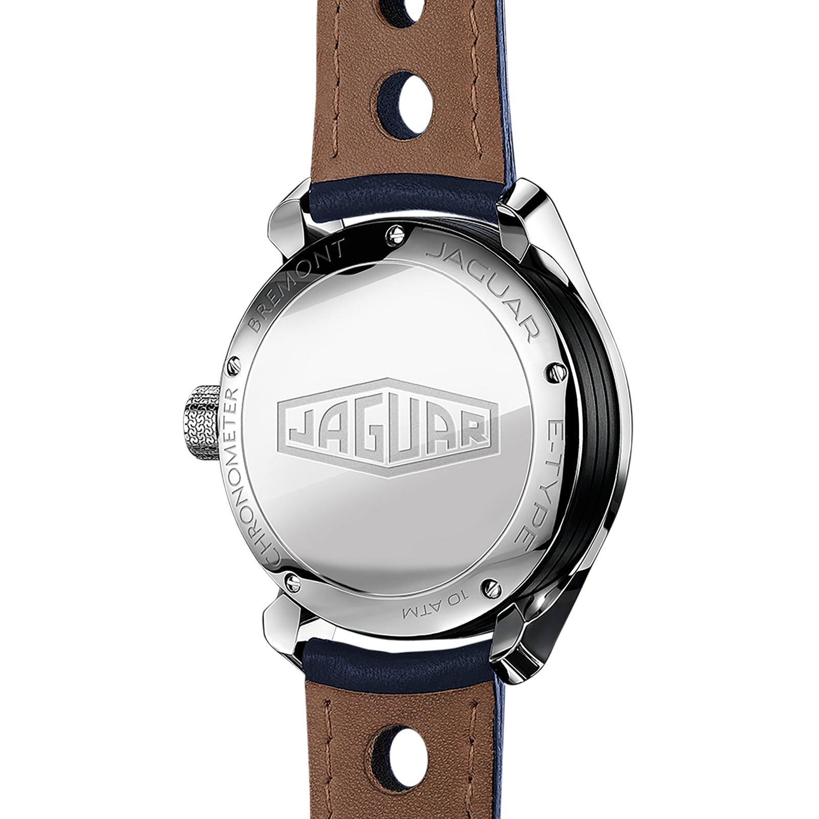 The MKIII is the most pared back timepiece in the range yet still very much in keeping with the design of the MKI and MKII. The MKIII by comparison has a slightly slimmer 43mm polished steel case; the black tachometer-inspired dial design features the date window at the six o'clock position and carries the Jaguar heritage logo right above it. Its hour markings are reminiscent of the numerals found on E-Type instruments and the dial features a distinctive ‘red line’ quadrant between three and four o'clock also paying homage to the E-Type's tachometer. As with the other models in this range the iconic winding crown harks back to the Lightweight E-Type using the same original Dunlop tyre tread, topped with the Jaguar heritage logo to match that of the dial.